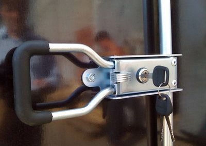 Второе: это замки. Замки бывают под два вида труб: диаметром 22 мм и диаметром 27 мм. Если у Вас высота ворот 2- 2,5 метра, то Вам можно поставить замок под трубу 22 мм, если больше 2,5 метров, то надо ставить замки по трубу диаметром 27 мм.